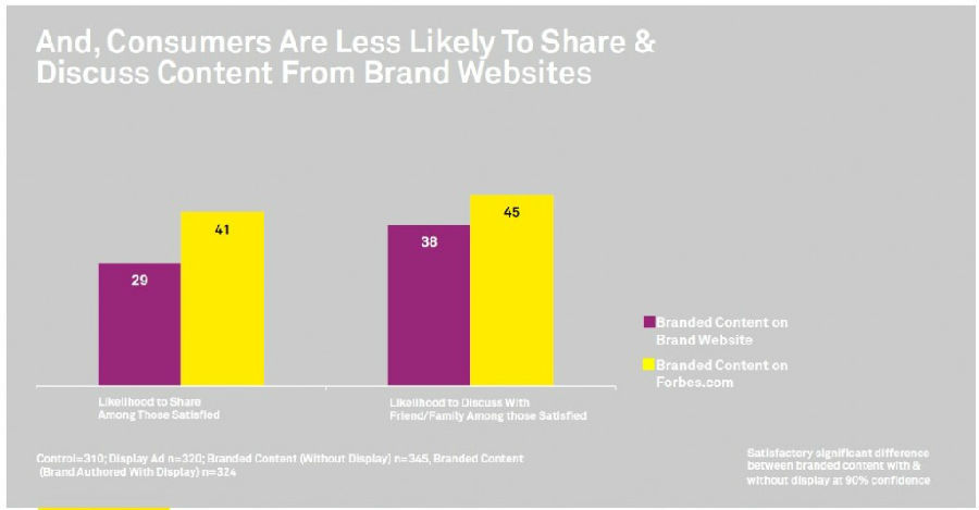 原生廣告的效果跟其發(fā)布的平臺也有很很大的聯(lián)系。研究發(fā)現(xiàn)發(fā)布在品牌自己網(wǎng)站上的原生內(nèi)容用戶分享的意愿不如發(fā)布在forbes上面的原生內(nèi)容,在Forbes上面的原生內(nèi)容用戶分享度要高41%??梢娙绻放频膬?nèi)容發(fā)布在更加真實可信的網(wǎng)站上會增加用戶的分享意愿,但這也是原生廣告招致批評的地方,混淆了內(nèi)容跟廣告的區(qū)別,透支了用戶對網(wǎng)站和編輯的信任度。